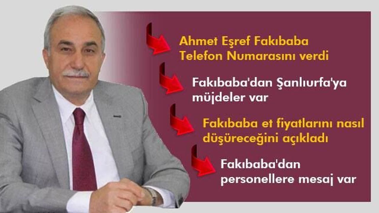 Gıda, Tarım ve Hayvancılık Bakanı Şanlıurfa Milletvekili Ahmet Eşref Fakıbaba, Şanlıurfa ile ilgi sorunlarınız için Urfa Masası Kurduk, Benim Telefon Numaramı veriyorum numaram 0530 027 59 79 danışmanlarıma vermişim sabah 07.00"den başlıyor gece saat 01.00"e kadar çalışıyor. Bir numara daha veriyorum bu da Ankara Hattı 0312 258 68 24-25 bu uygulamayı tüm Türkiye'ye yayacağız. Çözülen olaylarımız ile ilgili geri dönüşüm yapıyoruz, çözemedikçe çözmedik diye dönüyoruz. Ben Telefonlara şuan da bakamıyorum, bir bakıyorsun bakanlar kurulundayım, bir bakıyorsunuz başbakanımızın yanımdayım.