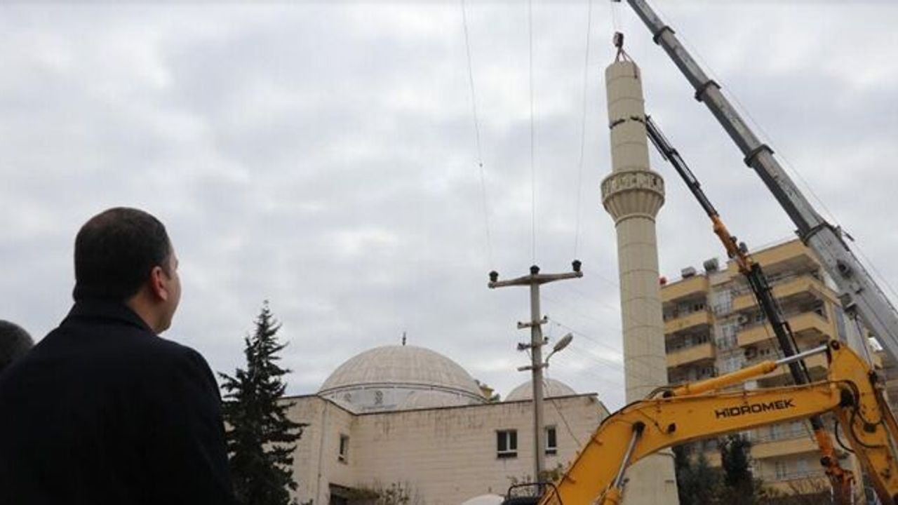 Elazığ'ın Sivrice ilçesi merkezli 6.8'lik depremin hissedildiği Şanlıurfa'da sarsıntı sırasında Karaköprü İlçesi Karşıyaka Mahallesinde bulunan Hz. Aişe Camii'nin 45 metre yüksekliğindeki eğik minaresi, kontrollü şekilde yıkılmaya başlandı.