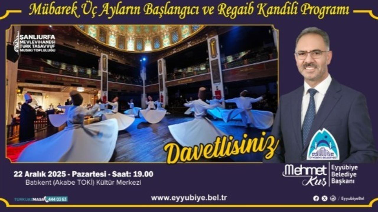 Eyyübiye Belediye Başkanı Mehmet Kuş"un talimatlarıyla düzenlenen programların ilki, 22 Aralık 2025 Pazartesi günü saat 19.00"da gerçekleştirilecek. Batıkent TOKİ Mahallesi"ndeki Eyyübiye Belediyesi Kültür Merkezinde düzenlenecek programda, Şanlıurfa Mevlevihanesi Türk Tasavvuf Musikisi Topluluğu sahne alacak.