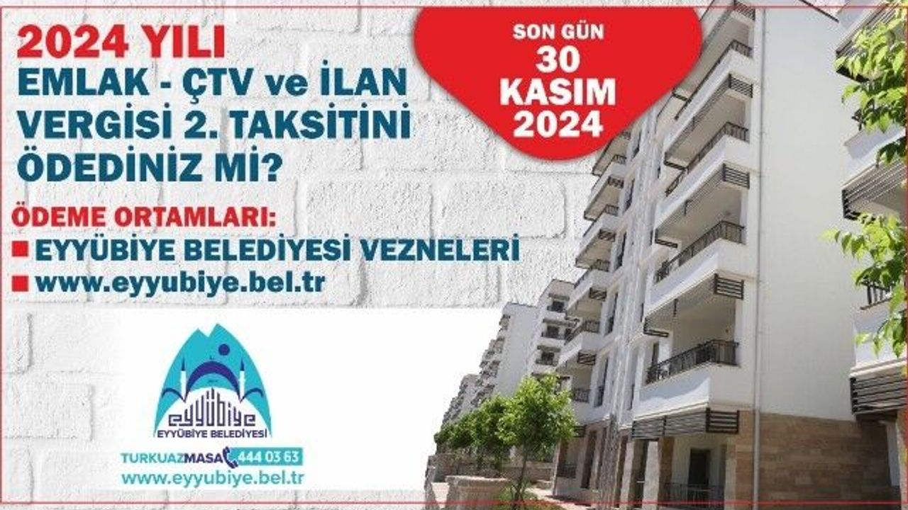 Duyuruda; 2024 yılı emlak, çevre temizlik ve ilan ve reklam vergisi ikinci taksitlerinin Eyyübiye Belediyesi veznelerinin yanı sıra www.eyyubiye.bel.tr internet sitesi e-belediye sekmesi üzerinden sicil numarası girilerek yapılabileceği ilan edildi.