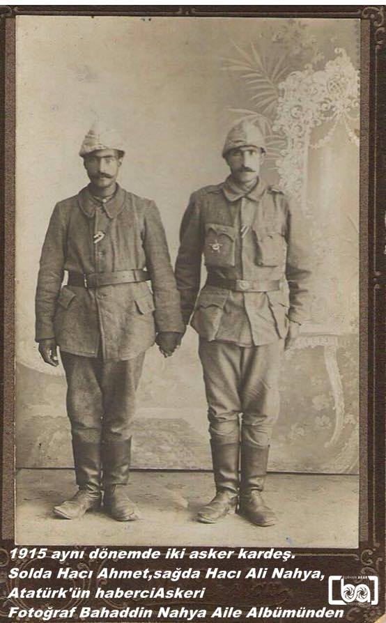 Çanakkale Aslanların1915 aynı dönemde Urfalı iki asker kardeş.nSolda Hacı Ahmet,sağda Hacı Ali Nahya,nAtatürk'ün haberci AskerinFotoğraf Bahaddin Nahya Aile Albümünden