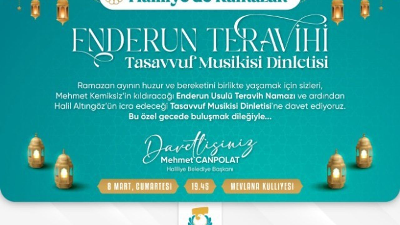 8 Mart Cumartesi günü Mevlana Camii'nde gerçekleştirilecek olan program, teravih namazı öncesinde saat 19.45"te başlayacak. Haliliye Belediyesi, tüm vatandaşları bu manevi atmosferi birlikte yaşamaya davet ediyor.