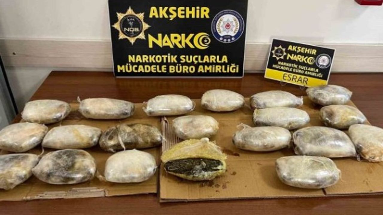 Edinilen bilgilere göre, Akşehir İlçe Emniyet Müdürlüğü Narkotik Suçlarla Mücadele Büro Amirliği ekibi ile Konya Narkotik Suçlarla Mücadele Şube Müdürlüğü ekipleri gençleri ve geleceği zehirlemek için sokak satıcılığı yapanlara yönelik çalışmalarına devam ediyor. Bu çerçevede yapılan istihbari çalışmalarda çevre illerden ilçeye uyuşturucu madde getirileceğini belirleyen ekipler, M.Ç.'yi ve geldiği aracı takibe aldı. Şüpheli şahsın bulunduğu araç D-300 Karayolu üzerinde ekipler tarafından durdurularak arama yapıldı. Yapılan aramada valizinin iç kısmına zulalanmış piyasa değeri yaklaşık 5 milyon lira olan 20 paket halinde 11 kilo esrar ele geçirilirken, M.Ç. gözaltına alındı. M.Ç. hakkında 'uyuşturucu madde bulundurmak, kullanmak, kabul etmek ve uyuşturucu madde ticareti' suçlarından işlem yapılarak adliyeye sevk etti. Şüpheli şahıs çıkarıldığı mahkemece tutuklanarak cezaevine gönderildi.