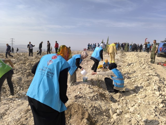 Etkinlikte gönüllüler, çok sayıda fidanı toprakla buluşturdu ve fidanlara ilk can suyunu verdi.