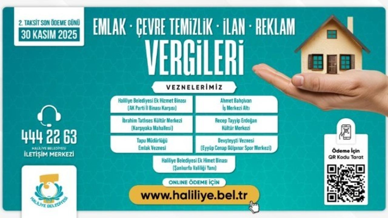 Haliliye Belediyesi, 2025 yılı Emlak, İlan-Reklam ve Çevre Temizlik Vergisi 2. taksit ödemelerinde son günün 30 Kasım 2025 olduğunu hatırlatarak, vatandaşların cezalı duruma düşmemeleri için ödemelerini zamanında yapmaları gerektiğini bildirdi.