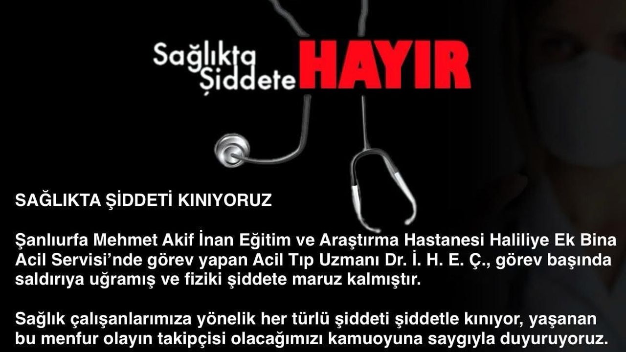 Yapılan açıklamada, Şanlıurfa Mehmet Akif İnan Eğitim ve Araştırma Hastanesi Haliliye Ek Hizmet Binası Acil Servisi’nde görev yapan Acil Tıp Uzmanı Dr. İ. H. E. Ç.’nin görev başında saldırıya uğradığı ve fiziki şiddete maruz kaldığı belirtildi.