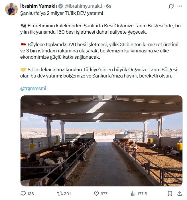Bakan Yumaklı, et üretiminin kalelerinden biri olan Şanlıurfa Besi Organize Tarım Bölgesi’nde, 2026 yılının ilk yarısında 150 besi işletmesinin daha faaliyete geçeceğini belirtti.